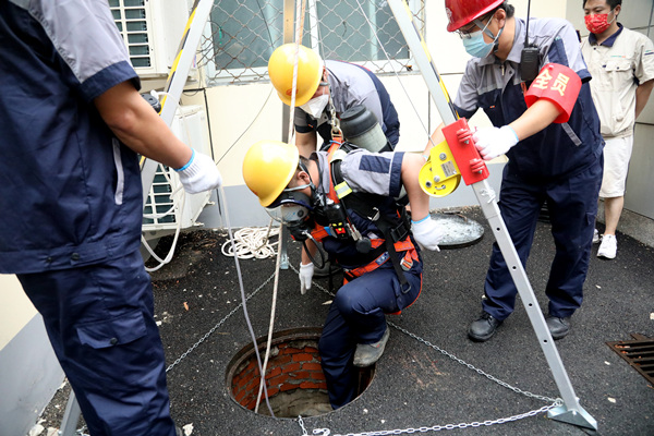 此次演練分為前期準備、有限空間規(guī)范作業(yè)及作業(yè)人員遇險科學施救流程演示三個部分。首先,參演人員依次展示了作業(yè)審批、安全交底、工具檢查、現(xiàn)場安全檢查、封閉作業(yè)區(qū)域并設置警示標志等作業(yè)前期準備工作。隨后,對有限空間出入口的有毒有害氣體、氧氣濃度進行檢測并進行自然通風或使用機械設備進行強制通風,待監(jiān)測評估符合作業(yè)要求后,架設救援用三腳架,參演人員穿戴好有限空間作業(yè)器具并經檢查合格后,在持續(xù)通風并有人員進行安全監(jiān)護的條件下,下井作業(yè)。最后,為避免因有限空間作業(yè)發(fā)生事故后盲目施救而產生連鎖事故,由救援人員展示如何正確穿戴呼吸器等救援防護用品并確保自身安全的前提下下井救援,利用三腳架等設備將受困人員安全救出并脫離危險場所的同時呼叫救援,進行心肺復蘇等規(guī)范施救流程。