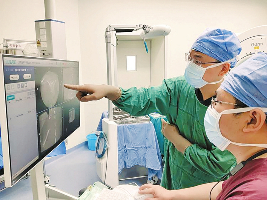 近日,山西醫(yī)科大學(xué)第二醫(yī)院趙斌教授、趙軼波副主任醫(yī)師團(tuán)隊完成省內(nèi)首例脊柱機(jī)器人導(dǎo)航可視化置釘手術(shù),耗時2小時,出血量僅50毫升,患者術(shù)后恢復(fù)良好,第3天可下床活動。手術(shù)在機(jī)器人的輔助下,精準(zhǔn)有效置入椎弓根螺釘,縮短了手術(shù)時間,有效控制術(shù)中出血,顯著減少了放射線對醫(yī)生和患者的輻射,極大提高了手術(shù)效率和安全性。(周慧芳 高志國圖/文)