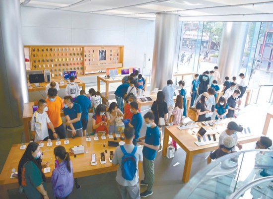 昨天,王府井APM購物中心蘋果產(chǎn)品零售店內(nèi),顧客在手機展示臺前駐足瀏覽,商場內(nèi)客流逐漸恢復。本報記者 和冠欣攝