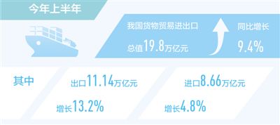 本報北京7月13日電?。ㄓ浾叨藕?jù)海關(guān)統(tǒng)計,今年上半年我國貨物貿(mào)易進(jìn)出口總值19.8萬億元,同比增長9.4%。其中,出口11.14萬億元,增長13.2%;進(jìn)口8.66萬億元,增長4.8%。