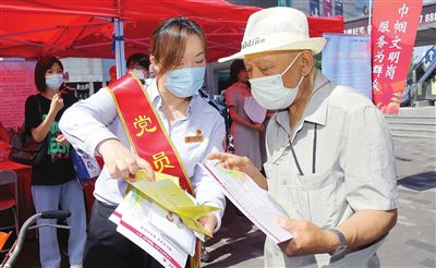 7月13日上午,天津市和平區(qū)濱江道樂(lè)賓百貨門(mén)前,市第十二次黨代會(huì)精神宣講展位彩旗招展,群眾絡(luò)繹不絕。來(lái)自衛(wèi)健、科技、政法、交通、公共服務(wù)、社會(huì)組織等方面50多個(gè)各級(jí)各類的為民服務(wù)窗口型“巾幗文明崗”“巾幗建功先進(jìn)集體”志愿者齊聚,以學(xué)習(xí)宣傳貫徹市第十二次黨代會(huì)精神暨“迎盛會(huì)、鑄忠誠(chéng)、強(qiáng)擔(dān)當(dāng)、創(chuàng)業(yè)績(jī)”巾幗文明崗為群眾服務(wù)活動(dòng)為主題,開(kāi)展多項(xiàng)便民服務(wù)。