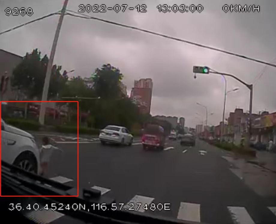 車載監(jiān)控畫面顯示,路口正值綠燈,一位4歲左右的兒童突然從斑馬線上跑出,橫穿馬路。危急時(shí)刻,開在道路最右側(cè)車道的濟(jì)南公交B120路駕駛員張濱迅速踩下剎車,在公交車停下的同時(shí),張濱為提醒其它車輛注意到在駕駛視線盲區(qū)的兒童,趕緊將手伸出窗外不停揮舞、呼喊。