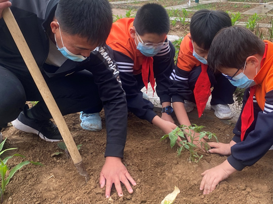 河北省威縣第五中學教育集團師生在勞動教育實踐基地移栽西紅柿植株。 趙國華攝