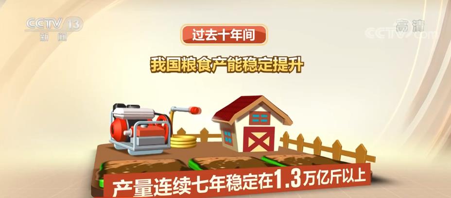 過去十年間,我國糧食產(chǎn)能穩(wěn)定提升,產(chǎn)量連續(xù)七年穩(wěn)定在1.3萬億斤以上,十年再上一個千億斤新臺階。人均糧食產(chǎn)量達(dá)到483.5公斤,高于國際公認(rèn)的400公斤糧食安全線,做到了谷物基本自給、口糧絕對安全。