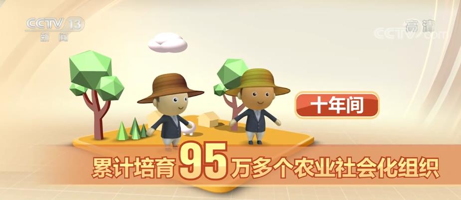 十年間,累計培育95萬多個農(nóng)業(yè)社會化組織,服務(wù)面積近17億畝次,服務(wù)帶動小農(nóng)超過7800萬戶。全國農(nóng)作物耕種收綜合機械化水平從57%提高到72%以上,水稻、玉米、小麥三大糧食作物機械化率分別超過85%、90%和97%。