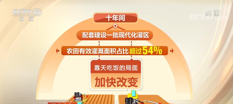 十年間,農(nóng)業(yè)基礎(chǔ)設(shè)施明顯改善,累計建成9億畝高標(biāo)準(zhǔn)農(nóng)田,配套建設(shè)一批現(xiàn)代化灌區(qū),農(nóng)田有效灌溉面積占比超過54%,靠天吃飯的局面加快改變。