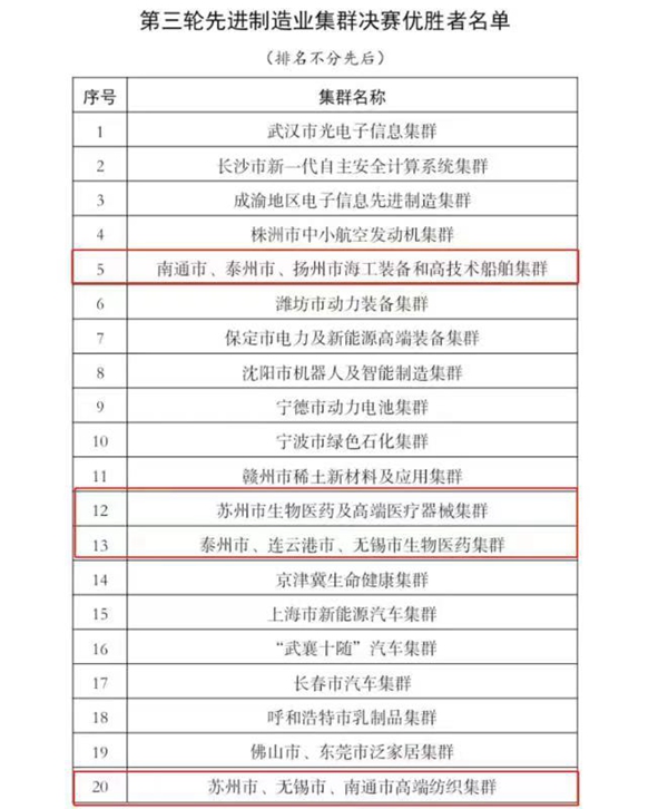 自2019年啟動先進制造業(yè)集群培育工作以來,工信部圍繞新一代信息技術(shù)、高端裝備、新材料、生物醫(yī)藥等重點領域,搭建集群間相互比拼的“賽場”。此次江蘇入選的先進制造業(yè)集群分別是:南通市、泰州市、揚州市海工裝備和高技術(shù)船舶集群,蘇州市生物醫(yī)藥及高端醫(yī)療器械集群,泰州市、連云港市、無錫市生物醫(yī)藥集群,蘇州市、無錫市、南通市高端紡織集群。