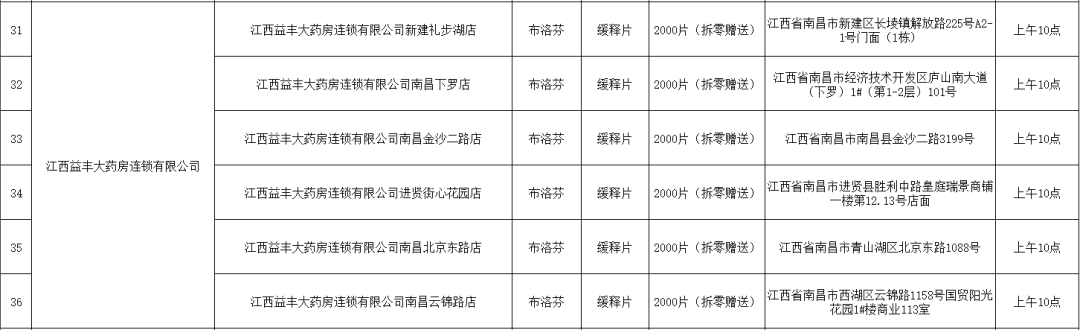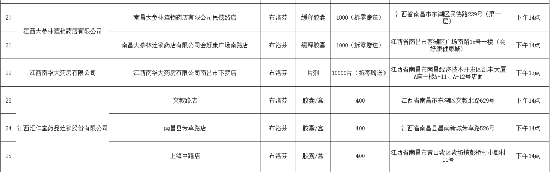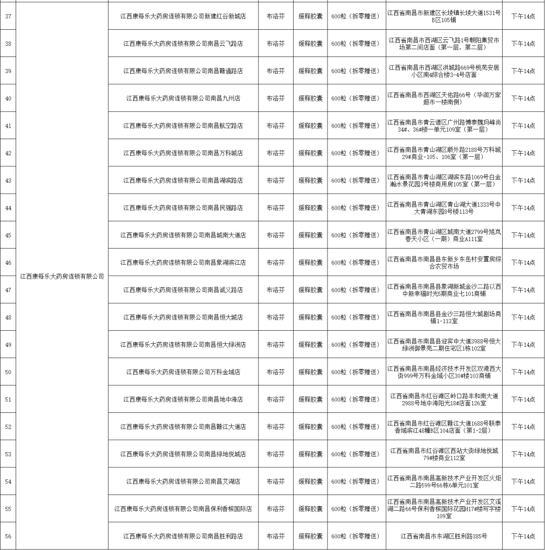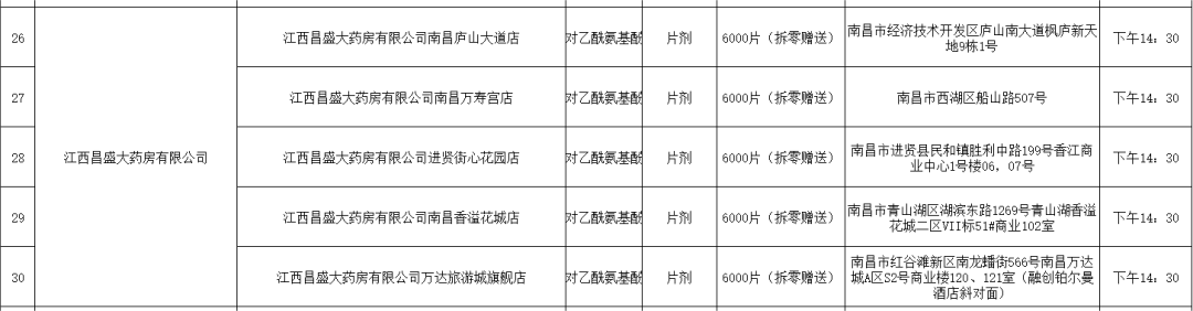 21日,南昌市市場(chǎng)監(jiān)督管理局公布退熱藥品投放名單(第二批),本批次名單共公布7家藥品零售企業(yè)共56家藥店的退熱藥品投放信息,分別是:江西黃慶仁棧華氏大藥房有限公司、江西大參林連鎖藥店有限公司、江西南華大藥房有限公司、江西匯仁堂藥品連鎖股份有限公司、江西昌盛大藥房有限公司、江西益豐大藥房連鎖有限公司、江西康每樂大藥房連鎖有限公司。