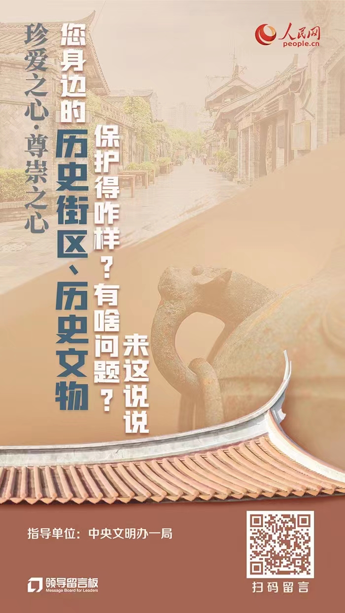 在你的家鄉(xiāng),或你現(xiàn)在生活、工作的地方,是否有具備保護價值的歷史街區(qū)與文物古跡?對于這些歷史街區(qū)與文物古跡的保護、展示與利用,你又是否有哪些建議或創(chuàng)新想法?歡迎來“領(lǐng)導留言板”說說()。