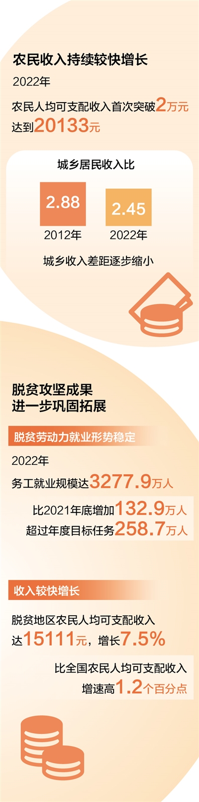 增加農(nóng)民收入是“三農(nóng)”工作的中心任務。2022年,農(nóng)民人均可支配收入首次突破2萬元,城鄉(xiāng)居民收入比從2012年的2.88下降到2022年的2.45,城鄉(xiāng)收入差距逐步縮小。“也要看到,當前農(nóng)民收入增速有所放緩,增收動能有所減弱。必須高度重視,拿出長短結合、務實管用的硬措施,拓寬農(nóng)民增收致富渠道。”中央農(nóng)辦專職副主任、農(nóng)業(yè)農(nóng)村部黨組成員吳宏耀說。對此,今年中央一號文件在穩(wěn)定就業(yè)、經(jīng)營增效、挖潛財產(chǎn)收入以及拓展轉移收入等方面作出相關部署,努力讓農(nóng)民腰包越來越鼓,日子越過越紅火。
