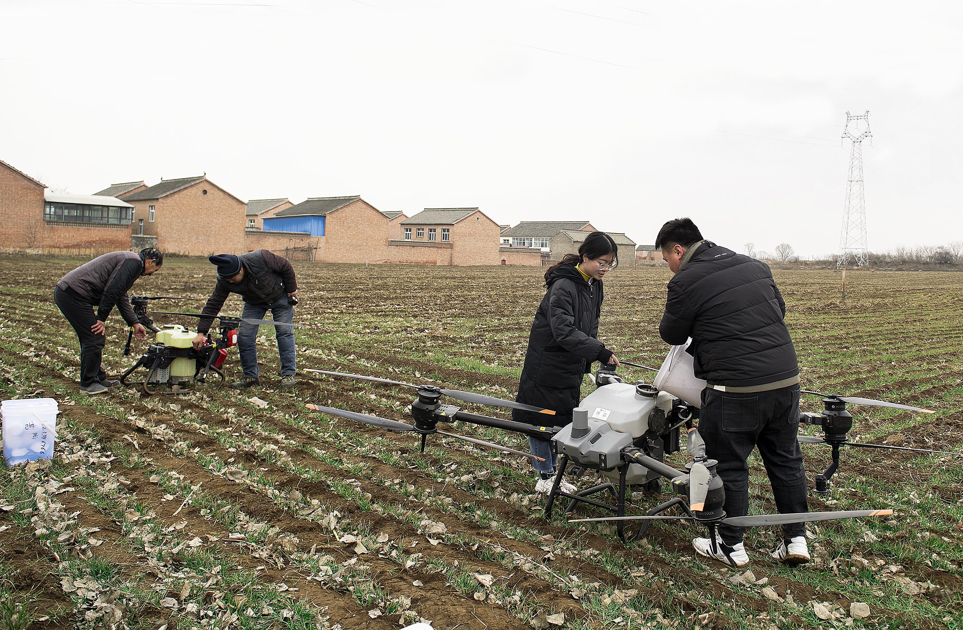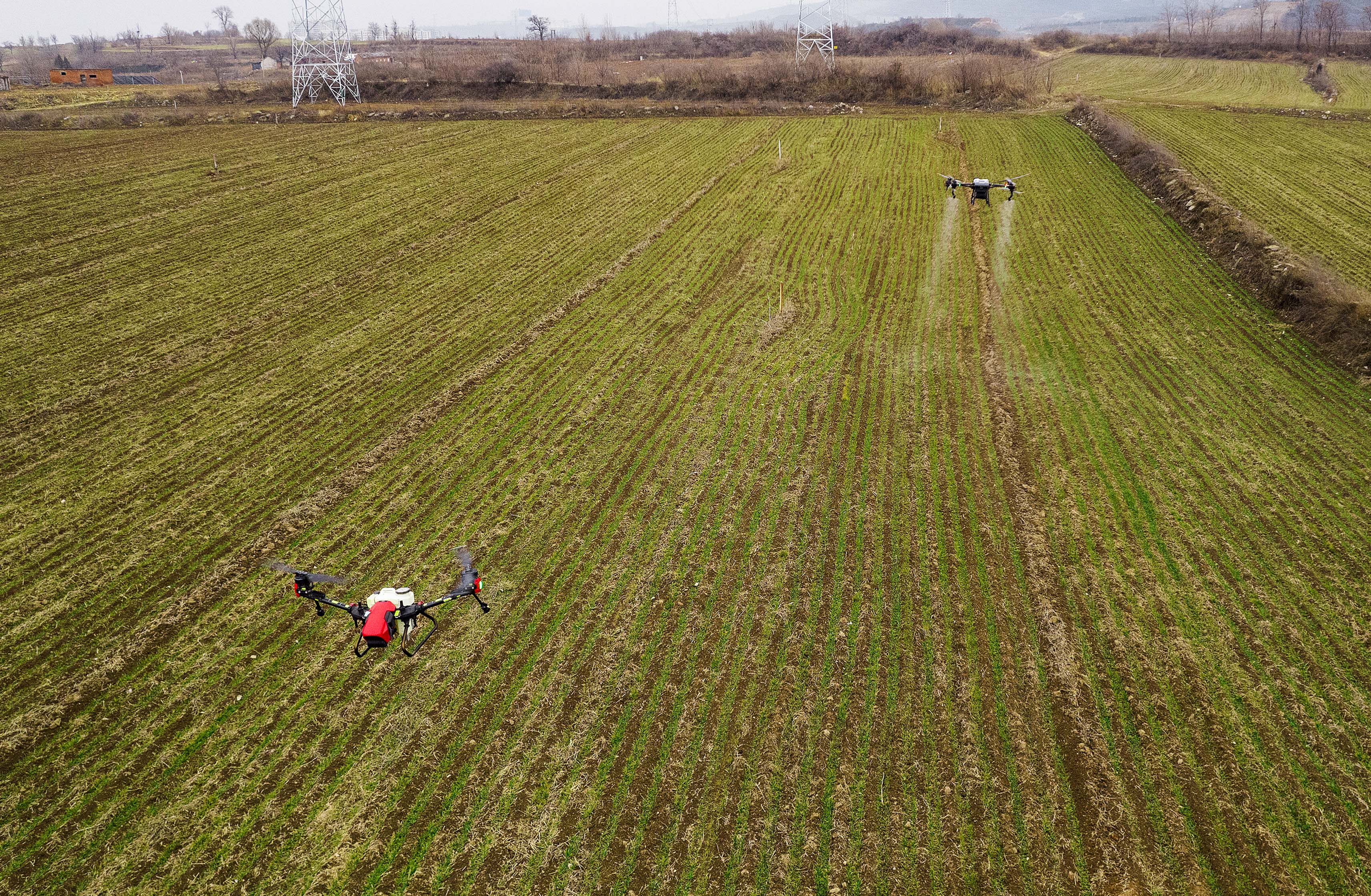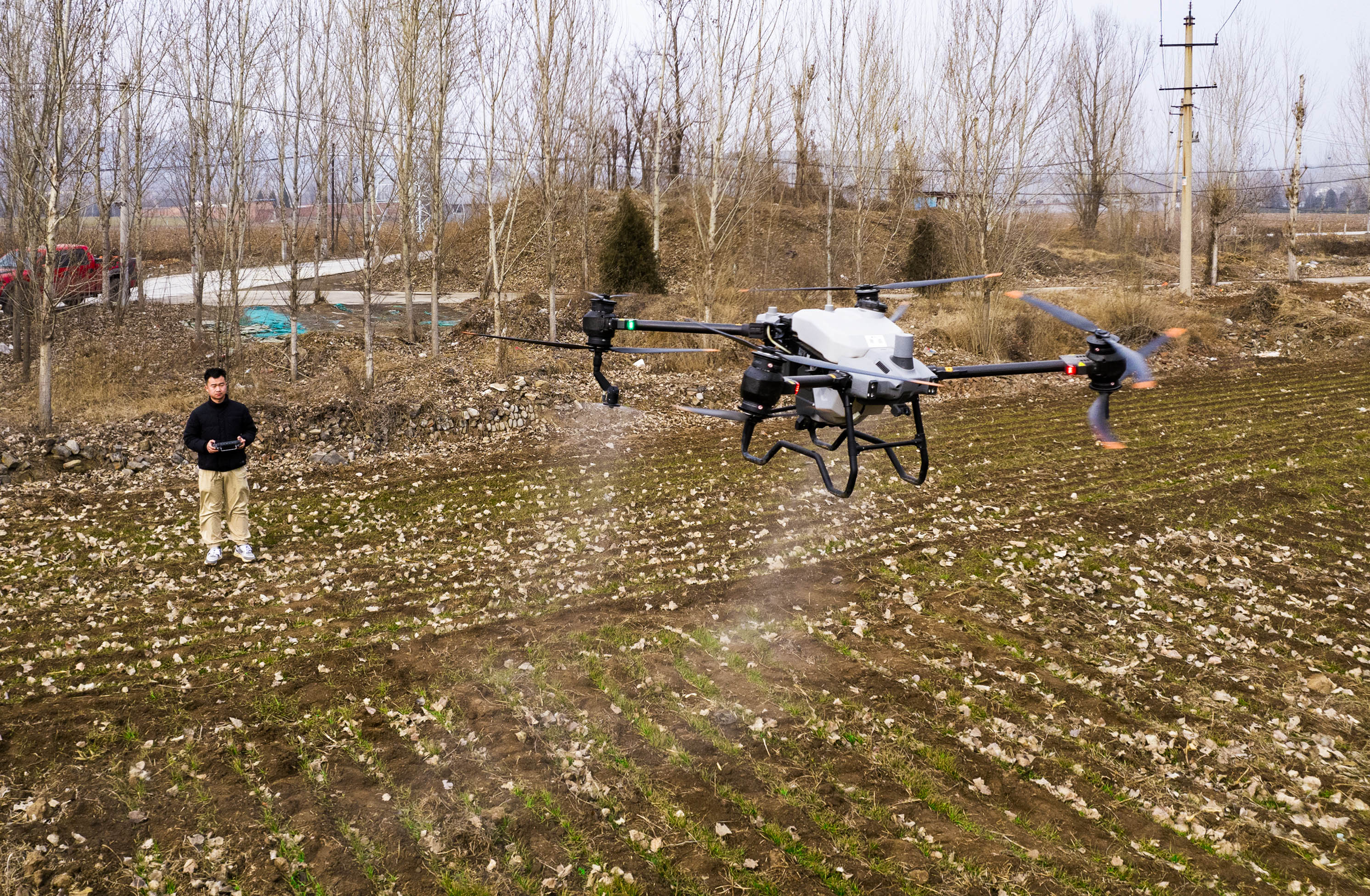 2月15日,在晉城市城區(qū)南村鎮(zhèn),操作員正熟練地遙控農(nóng)業(yè)專(zhuān)用無(wú)人機(jī)給麥田播撒肥料,大大提高了工作效率。