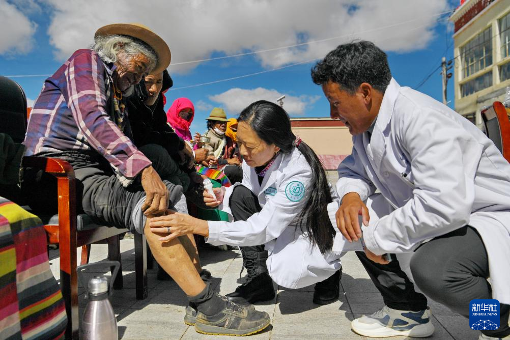 8月18日,在阿里地區(qū)措勤縣曲洛鄉(xiāng),西藏阜康腫瘤醫(yī)院康復理療師唐穎(右二)為當?shù)厝罕娏x診。新華社記者 張汝鋒 攝
