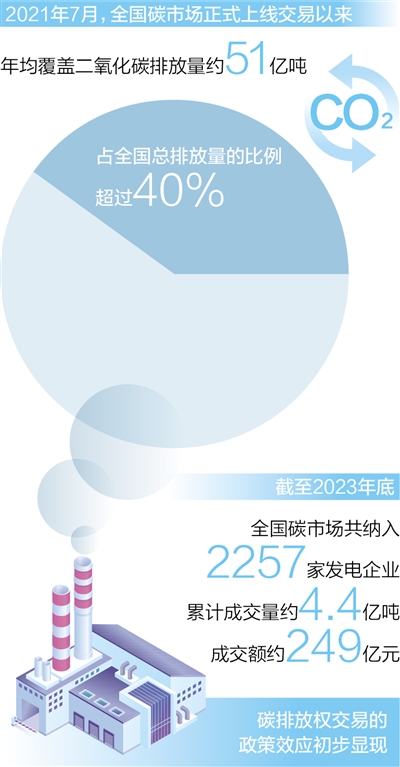 2021年7月全國碳市場正式上線交易以來,運行整體平穩(wěn),年均覆蓋二氧化碳排放量約51億噸,占全國總排放量的比例超過40%。截至2023年底,全國碳市場共納入2257家發(fā)電企業(yè),累計成交量約4.4億噸,成交額約249億元,碳排放權(quán)交易的政策效應初步顯現(xiàn)。