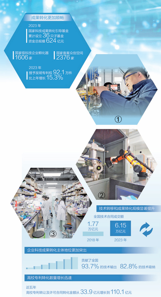 印發(fā)《“十四五”技術(shù)要素市場專項規(guī)劃》,從健全科技成果產(chǎn)權(quán)制度、強化高質(zhì)量科技成果供給等方面推動成果轉(zhuǎn)化;印發(fā)《專利轉(zhuǎn)化運用專項行動方案(2023—2025年)》,對專利轉(zhuǎn)化運用進行專門部署;制定《高校和科研機構(gòu)存量專利盤活工作方案》,發(fā)揮市場和政府的協(xié)同作用,共同推動專利成果更好更快地轉(zhuǎn)化為現(xiàn)實生產(chǎn)力……近年來,一系列部署,一項項探索,讓創(chuàng)新鏈的好技術(shù)變成產(chǎn)業(yè)鏈的新應(yīng)用,科技創(chuàng)新正在成為培育發(fā)展新質(zhì)生產(chǎn)力的新動能。