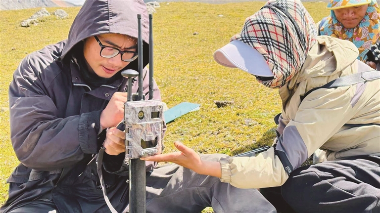 保護(hù)中心工作人員李義旺教當(dāng)?shù)剞r(nóng)牧民架設(shè)紅外相機(jī)。