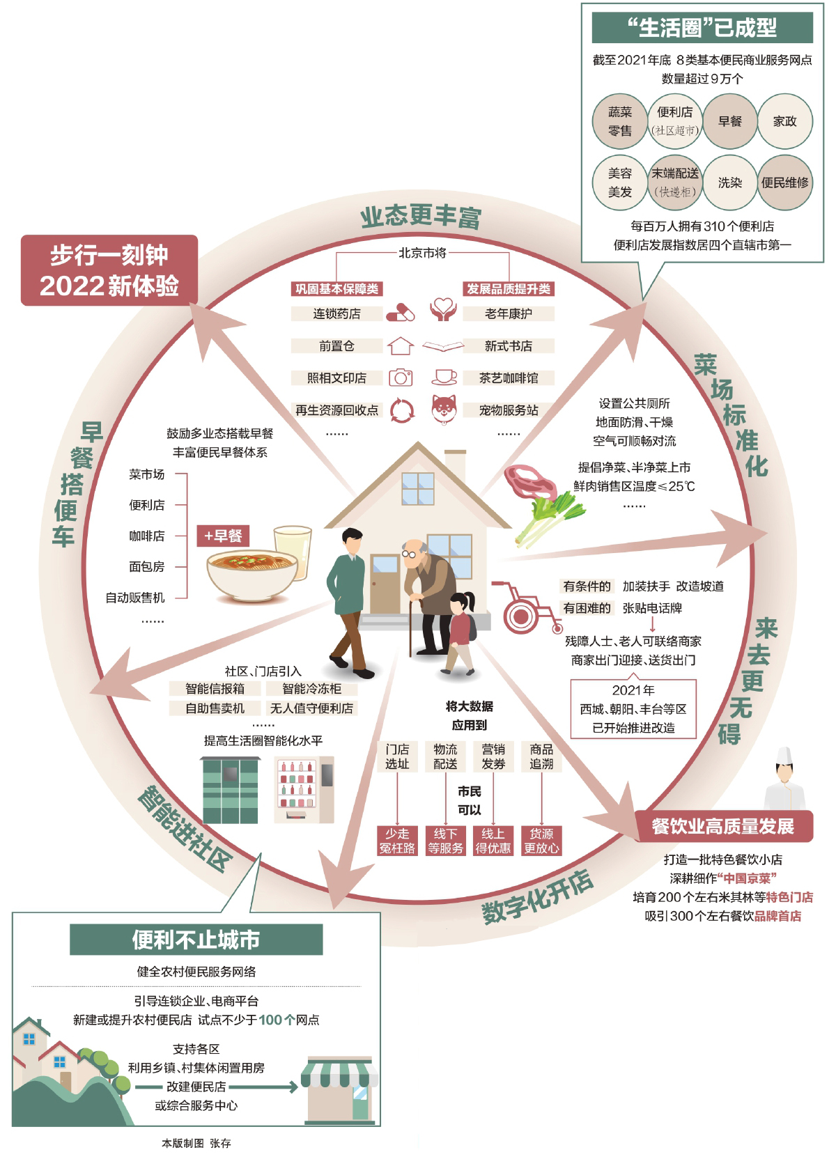 走出家門15分鐘內(nèi),有熱氣騰騰的早餐、新鮮上架的蔬果,修車、理發(fā)、取快遞一趟全部辦妥。截至2021年底,全市蔬菜零售、便利店(社區(qū)超市)、早餐、家政等8類基本便民商業(yè)網(wǎng)點(diǎn)超過9萬個(gè),“一刻鐘便民生活圈”歷經(jīng)十余年建設(shè)輪廓已現(xiàn)。市商務(wù)局2022年將加快打造“一刻鐘便民生活圈”,優(yōu)化資金支持方向,優(yōu)先支持在便民設(shè)施不足區(qū)域新建亟須業(yè)態(tài)網(wǎng)點(diǎn),從豐富業(yè)態(tài)、加快智能化數(shù)字化、餐飲業(yè)高質(zhì)量發(fā)展等方面入手提升“生活圈”體驗(yàn)。 本報(bào)記者 馬婧 白歌