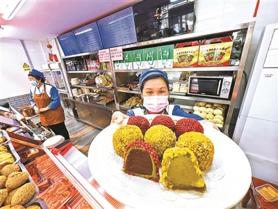 此外,北京稻香村各門店、護國寺小吃等多家門店,都為京城百姓準備了各色口味的青團。在位于東直門內(nèi)大街的北京稻香村“東城食尚店”里,一位女士正在選購著青團,她表示今天是特意來買北京稻香村新推出的青團小禮盒的,周末踏青時正好帶上與朋友分享。