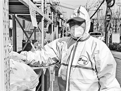 4月7日一早,在望京西園三區(qū)北門(mén)附近的管控區(qū)硬質(zhì)隔離圍欄內(nèi),小區(qū)物資配送小組工作人員正忙著將當(dāng)日的居民物資、快遞等進(jìn)行登記、分揀和消毒。隨后這些物資被分別送往每棟樓下的快遞架,再通知居民下樓自取。