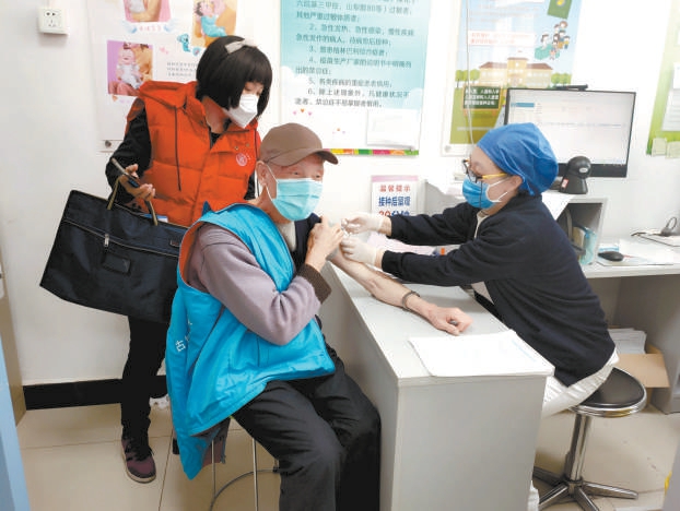 11日,石景山區(qū)古城街道60歲以上人員在社區(qū)工作人員的協(xié)助下接種新冠疫苗。古城街道社區(qū)通過“線上+線下”各種形式廣泛宣傳,持續(xù)推進(jìn)轄區(qū)60歲以上人員新冠疫苗接種工作。 吳鏑攝