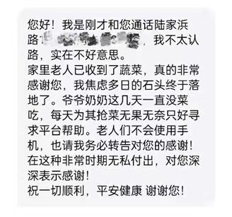 宋志勇的母親是一位使用智能手機不太“靈光”的老人。想到連短信都不會發(fā)的母親,再看到老人家屬代發(fā)的感謝短信,宋志勇覺得自己能成為應(yīng)急特需保供的一員挺榮幸。