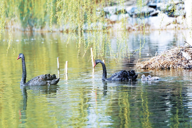 3月29日,圓明園九州景區(qū)后湖里,一對黑天鵝寶寶成功孵化,兩只小天鵝立即成為圓明園新寵,吸引了眾多攝影愛好者前來拍攝。黑天鵝一家在湖中時而靜靜游動,時而將頭扎進(jìn)水中覓食,映襯著一湖碧水和如煙的拂柳,構(gòu)成一幅絕美的自然畫面。湖邊還有一只黑天鵝正在孵蛋育雛,周邊放置的警戒線幫助黑天鵝安全育雛。游客們也只是遠(yuǎn)遠(yuǎn)地靜靜地看看,生怕驚擾了這“一家人”。