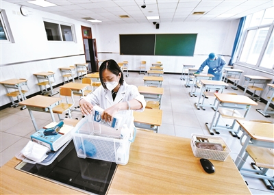 圖為工作人員對教室進(jìn)行清潔和消毒。攝影/本報(bào)記者 郝羿
