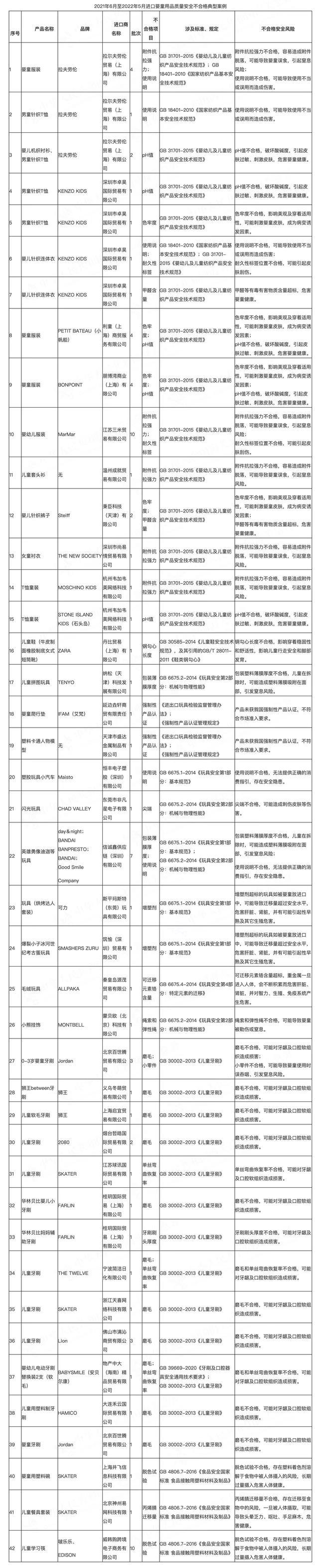 央廣網(wǎng)北京6月1日消息 據(jù)海關總署網(wǎng)站消息,6月1日,海關總署通報2021年6月至2022年5月間檢出的部分進口嬰童用品質(zhì)量安全不合格典型案例,包括服裝、童鞋、玩具、牙刷、食品接觸產(chǎn)品等5類82批次進口嬰童用品,涉及拉夫勞倫、KENZO KIDS、ZARA和獅王等多個品牌產(chǎn)品。