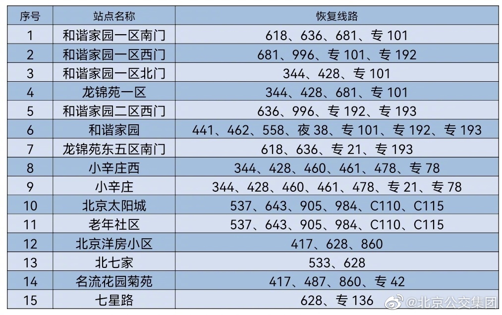 央廣網(wǎng)北京6月16日消息 據(jù)北京公交集團官博消息,按照防疫工作要求,自2022年6月16日首班車起,對前期途經(jīng)昌平區(qū)封管控區(qū)域周邊采取甩站措施的35條線路以及前期途經(jīng)豐臺區(qū)封管控區(qū)域周邊采取甩站措施的18條線路,恢復正常運營,恢復信息詳見下表。