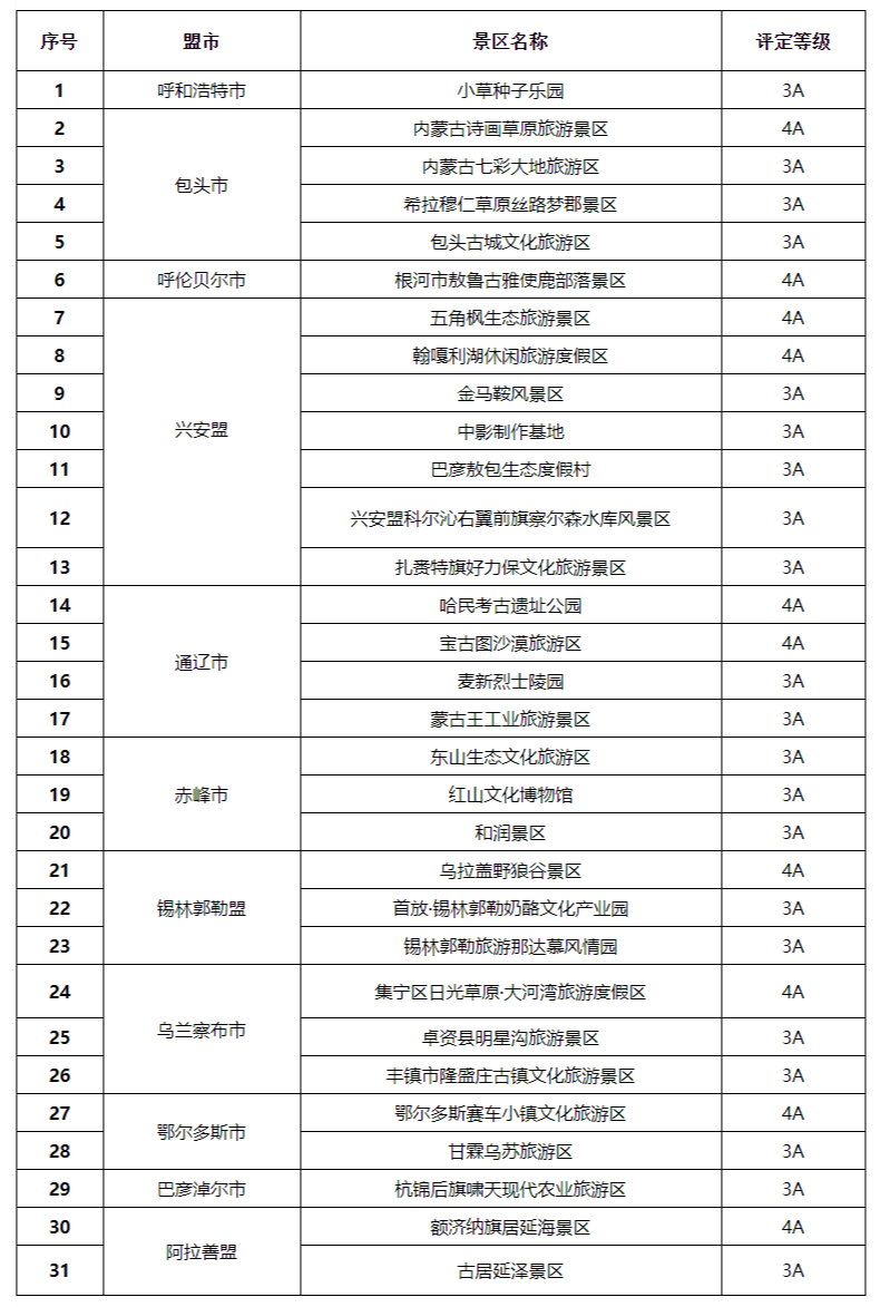 內蒙古2022年擬確定國家4A級和3A級旅游景區(qū)共31家