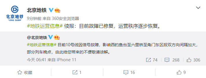 北京地鐵:10號線故障已修復(fù),運(yùn)營秩序逐步恢復(fù)