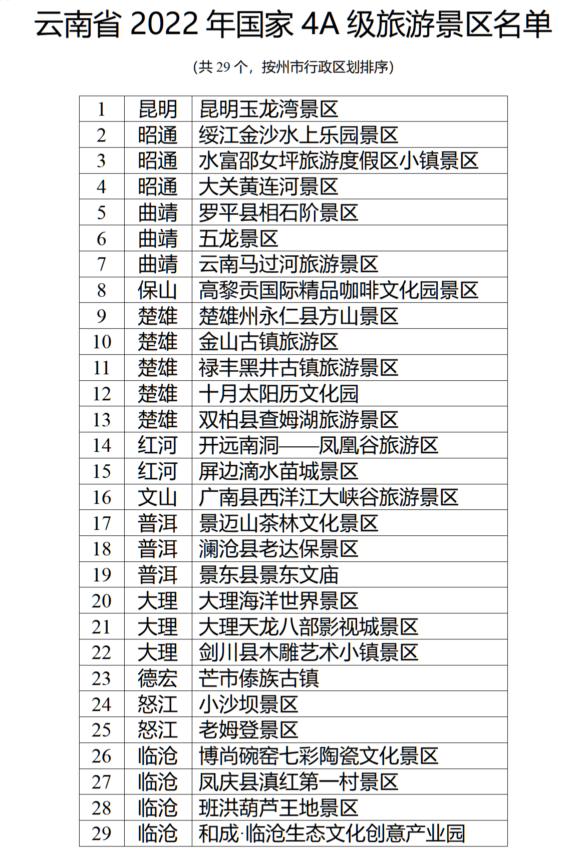 云南省2022年國家4A級(jí)旅游景區(qū)名單如下: