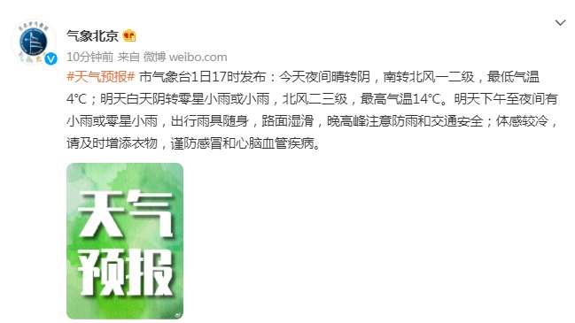 北京市氣象臺1日17時發(fā)布:今天(1日)夜間晴轉陰,南轉北風一二級,最低氣溫4℃;明天白天陰轉零星小雨或小雨,北風二三級,最高氣溫14℃。