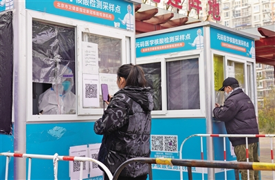 11月23日,朝陽區(qū)鴻博家園第四社區(qū),居民掃碼登記進行核酸檢測。 新京報記者 王飛 攝