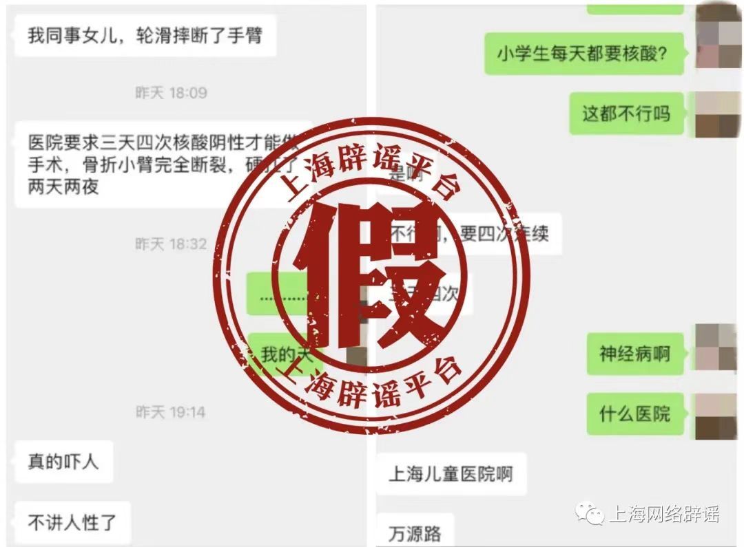 “上海一醫(yī)院要求兒童三天四次核酸才能做手術(shù),孩子骨折小臂斷裂,硬抗了兩天兩夜。”不久前,一條聊天記錄在陸先生的家屬群引發(fā)熱議。因?yàn)楸斫阋患疑钤谏虾?,親戚還特意提醒她照顧好孩子。而很快,官方發(fā)布辟謠消息,稱經(jīng)過多路求證,聊天記錄中所指醫(yī)院并沒有三天四次核酸檢測陰性才能手術(shù)的要求,院方也未核查到存在所傳相似情況的病人。