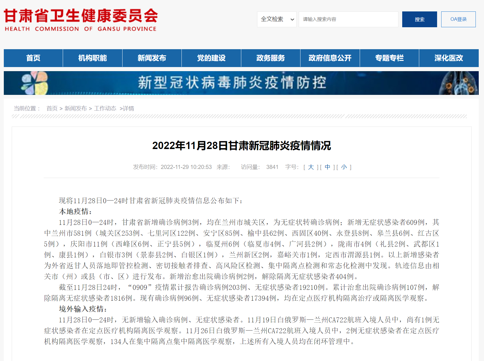 11月28日甘肅新增確診病例3例,無(wú)癥狀感染者609例