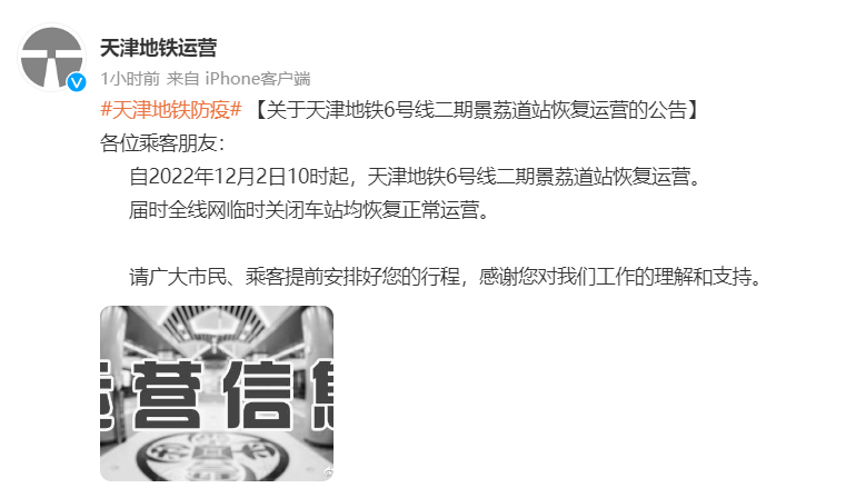 12月2日起天津地鐵全線網(wǎng)臨時(shí)關(guān)閉車站均恢復(fù)運(yùn)營(yíng)