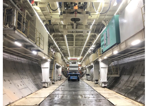 珠海興業(yè)快線隧道工程現(xiàn)場(chǎng),一臺(tái)重4500噸、超5層樓高的“地下航母”正奮勇掘進(jìn),管片一片一片拼裝,隧道隨之一米一米建成。這臺(tái)“地下航母”,就是由中交天和自主研制的中國(guó)首臺(tái)超大直徑同步掘進(jìn)機(jī)“興業(yè)號(hào)”,這也是國(guó)內(nèi)首次采用的同步掘進(jìn)設(shè)計(jì)。常規(guī)隧道掘進(jìn)機(jī)拼裝管片,一環(huán)管片寬2米,刀頭油缸推動(dòng),而油缸推動(dòng)距離僅為2米多。因而,掘進(jìn)2米后必須停止,掘進(jìn)一環(huán)耗時(shí)近60分鐘,拼裝管片一環(huán)耗時(shí)近45分鐘?!芭d業(yè)號(hào)”的關(guān)鍵在于同步掘進(jìn),它改變了傳統(tǒng)油缸設(shè)計(jì),推動(dòng)距離可延長(zhǎng)至4米,刀頭可實(shí)現(xiàn)持續(xù)掘進(jìn),后方同時(shí)拼裝管片,施工速度較國(guó)內(nèi)外同類掘進(jìn)機(jī)提升25-35%,對(duì)超大直徑盾構(gòu)機(jī)發(fā)展具有一定劃時(shí)代意義。