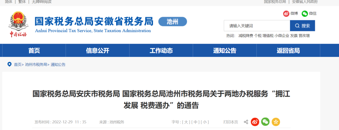 為方便安慶池州兩地納稅人繳費(fèi)人辦理跨區(qū)域涉稅事項(xiàng),落實(shí)安慶池州“一江兩岸擁江發(fā)展”規(guī)劃,進(jìn)一步優(yōu)化稅收營商環(huán)境,根據(jù)安徽省稅務(wù)局涉稅事項(xiàng)跨區(qū)域通辦文件精神,按照依法、規(guī)范、協(xié)作、穩(wěn)妥的原則,經(jīng)研究決定,國家稅務(wù)總局安慶市稅務(wù)局和國家稅務(wù)總局池州市稅務(wù)局開展跨區(qū)域事項(xiàng)通辦(以下簡稱“擁江通辦”事項(xiàng))工作,現(xiàn)將有關(guān)事項(xiàng)通告如下: