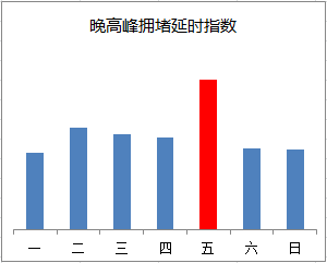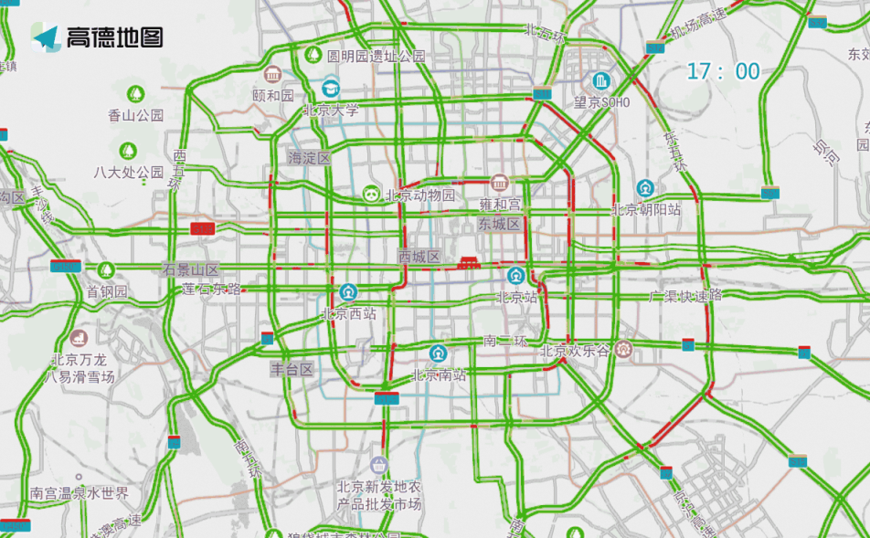 晚高峰期間,東、西、北二、三、四、五環(huán),東六環(huán)部分路段,以及萬泉河路至圓明園西路、通惠河北路、蓮石東路等城區(qū)道路出城方向車流集中,京藏高速、京承高速、京通快速、京港澳高速、機場高速等高速公路出京方向?qū)⒊霈F(xiàn)高峰車流,高峰時段為17:00—19:00,周五晚高峰提前且持續(xù)時間較長。