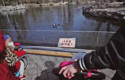 3月16日,北京動(dòng)物園,水禽湖邊多處設(shè)置了請勿投喂提示牌。