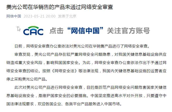 美光公司在華銷售的產(chǎn)品未通過(guò)網(wǎng)絡(luò)安全審查