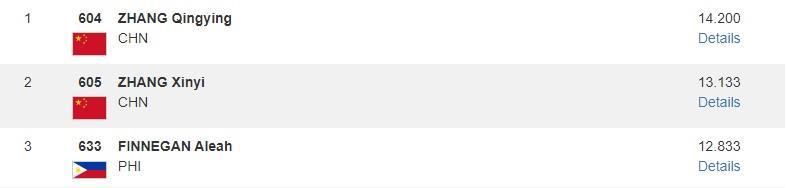 女子自由操項目,張清穎以13.233分再奪一枚金牌。另一名中國選手邱祺緣以12.133分排名第七。