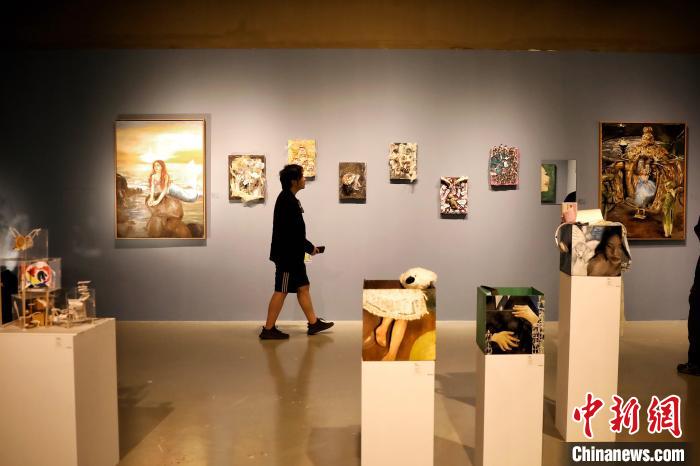 6月底,于飛在北京舉辦個人藝術(shù)展“啟程”。圖為于飛向觀眾介紹展出作品。 中新社記者 李雪峰 攝