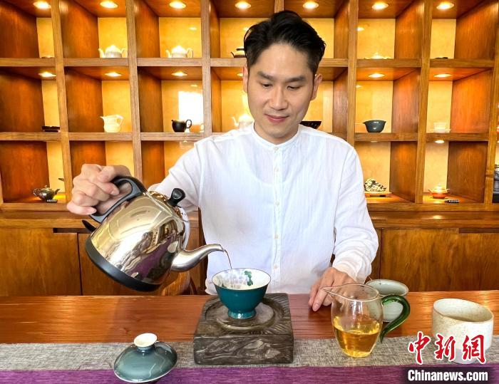 2023年6月,臺(tái)灣茶葉世家的后人張洪瑋接受中新社記者采訪?!≈行律缬浾?朱曉穎 攝