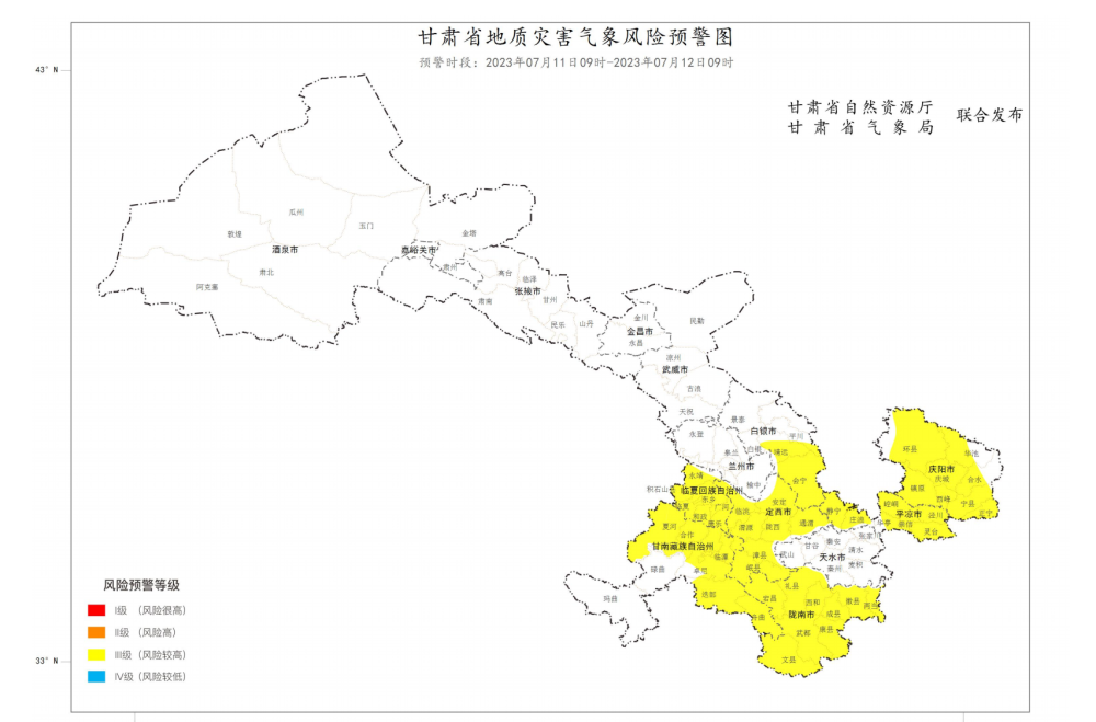 甘肅省自然資源廳、甘肅省氣象局于7月11日9時聯(lián)合發(fā)布地質(zhì)災(zāi)害氣象風(fēng)險預(yù)警:預(yù)計未來24小時內(nèi),白銀市靖遠縣、平川區(qū)、白銀區(qū)、會寧縣,定西市安定區(qū)、臨洮縣、通渭縣、渭源縣、隴西縣、漳縣、岷縣,甘南藏族自治州夏河縣、合作市、卓尼縣、臨潭縣、迭部縣、舟曲縣,臨夏回族自治州永靖縣、積石山保安族東鄉(xiāng)族撒拉族自治縣、東鄉(xiāng)族自治縣、臨夏縣、和政縣、廣河縣、康樂縣,隴南市禮縣、宕昌縣、兩當(dāng)縣、西和縣、徽縣、成縣、武都區(qū)、康縣、文縣,平?jīng)鍪徐o寧縣、崆峒區(qū)、涇川縣、莊浪縣、華亭市、崇信縣、靈臺縣,慶陽市環(huán)縣、華池縣、合水縣、鎮(zhèn)原縣、慶城縣、寧縣、西峰區(qū)、正寧縣因氣象因素致地質(zhì)災(zāi)害發(fā)生的風(fēng)險較高(黃色預(yù)警),部分地區(qū)預(yù)計6小時內(nèi)降雨量將達50毫米以上,已達50毫米以上的地區(qū)降雨可能持續(xù)。其中甘南州夏河縣累積雨量可達50毫米以上,隴南市文縣最大小時雨強可達30毫米以上。