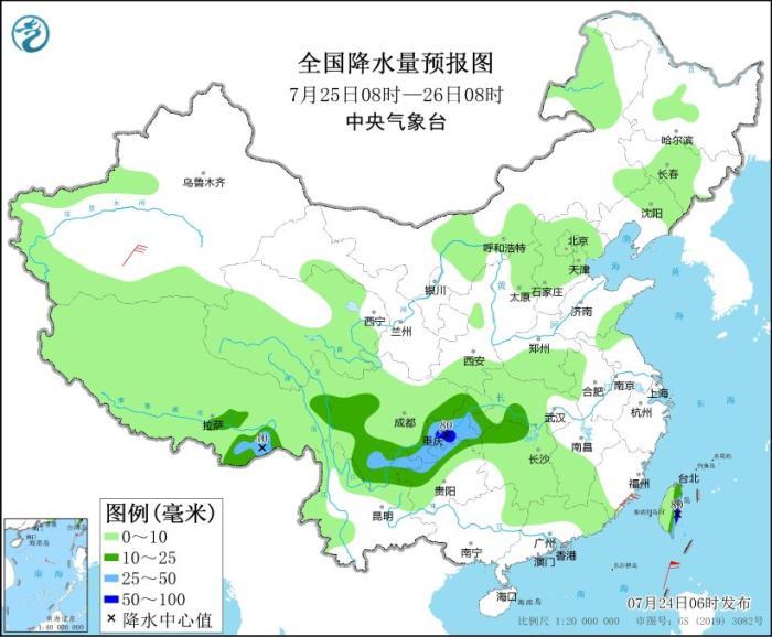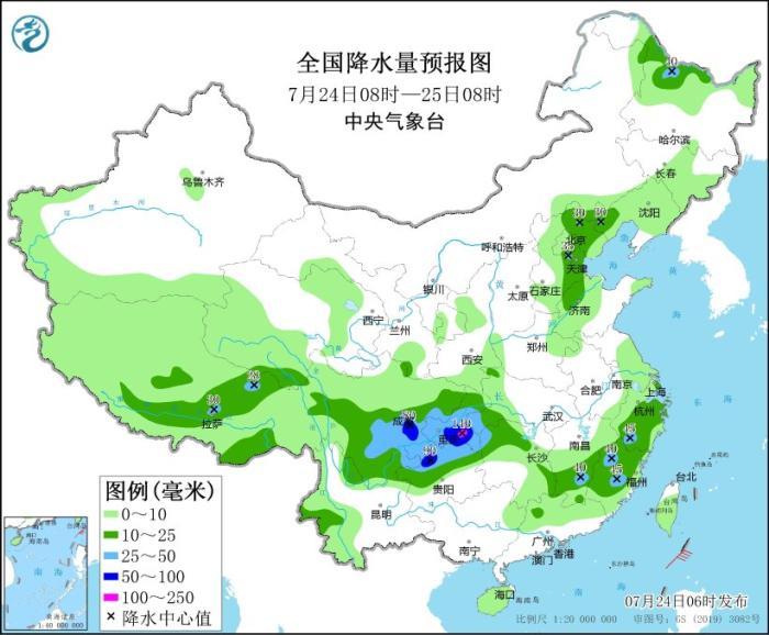預(yù)計(jì),7月24日08時(shí)至25日08時(shí),四川盆地中南部、重慶大部、貴州北部、云南東北部、湖北西南部、湖南西北部以及浙江南部、福建中北部、江西南部、黑龍江北部、西藏東部等地部分地區(qū)有大到暴雨,其中,重慶南部等地局部地區(qū)有大暴雨(100~140毫米)。上述部分地區(qū)伴有短時(shí)強(qiáng)降水(最大小時(shí)降雨量30~50毫米,局地可超過70毫米),局地有雷暴大風(fēng)等強(qiáng)對流天氣。中央氣象臺7月24日06時(shí)繼續(xù)發(fā)布暴雨藍(lán)色預(yù)警。