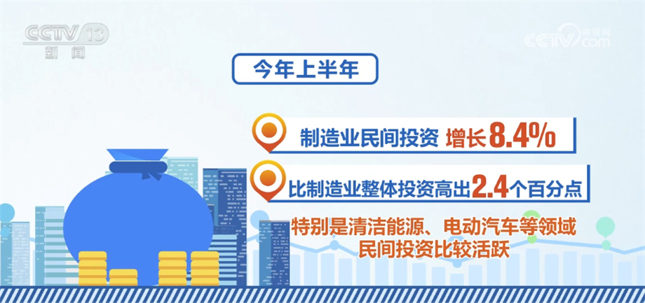 國家發(fā)展改革委相關負責人表示,當前,民間投資結(jié)構持續(xù)優(yōu)化,一些領域民間投資顯現(xiàn)了不少亮點。今年上半年,除房地產(chǎn)開發(fā)以外的民間投資同比增長9.4%,增速比全部投資高5.6個百分點;制造業(yè)民間投資增長8.4%,比制造業(yè)整體投資高出2.4個百分點,特別是清潔能源、電動汽車等領域民間投資比較活躍;基礎設施民間投資增長15.6%,比基礎設施整體投資高出8.4個百分點,呈現(xiàn)出較強的投資信心和投資動力。