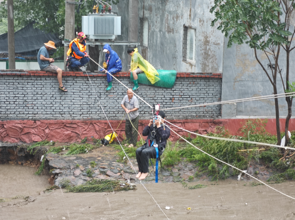 隨后,消防救援人員又來到距離此處約50米的第二處現(xiàn)場。在一個院子里,有16人被困,包括1名87歲老人和2名3歲兒童。消防救援人員搭設(shè)繩索通道,協(xié)助有行動能力的群眾在消防救援人員幫扶下蹚河轉(zhuǎn)移,同時對沒有行動能力的老人、兒童采取背負(fù)及橡皮艇救援的方式轉(zhuǎn)移。
