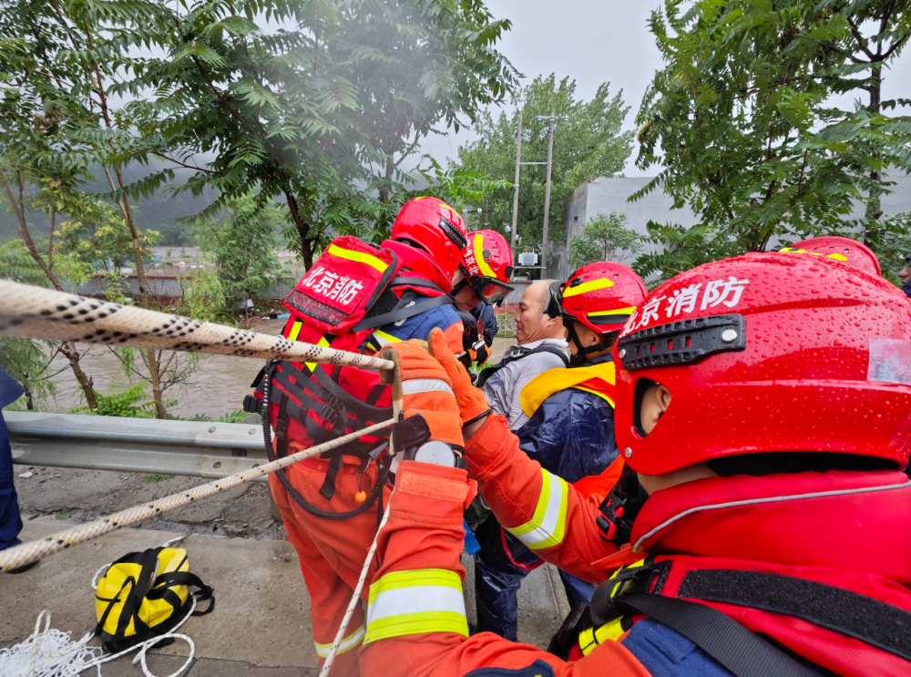13時許,在房山區(qū)青龍湖鎮(zhèn)救援安置了少年軍校基地被困人員后,北京消防特勤支隊(duì)的救援人員又接到報警稱,在距離此處9公里外的漫水河水文站有人員被困,現(xiàn)場指揮員立刻分派力量前往現(xiàn)場進(jìn)行救援。