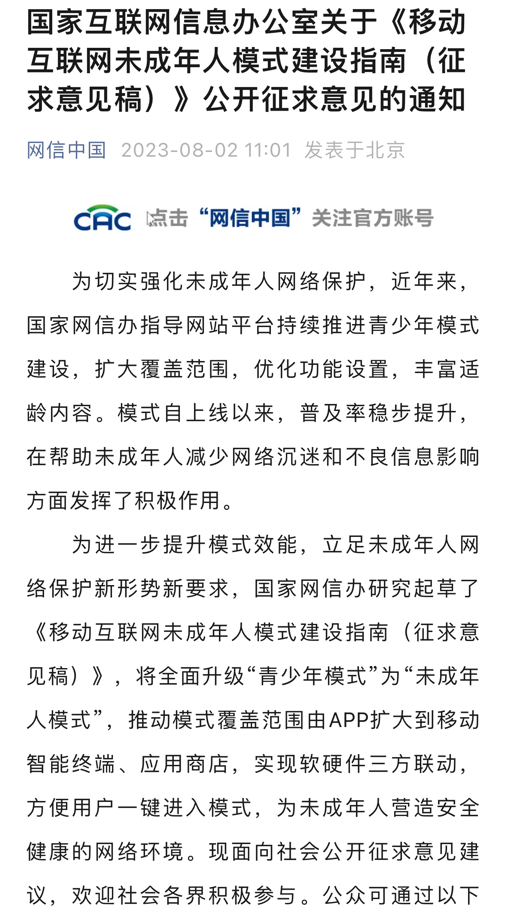 央廣網(wǎng)北京8月3日消息(總臺(tái)中國(guó)之聲記者馮爍)據(jù)中央廣播電視總臺(tái)中國(guó)之聲報(bào)道,為進(jìn)一步幫助未成年人減少網(wǎng)絡(luò)沉迷和不良信息影響,國(guó)家網(wǎng)信辦8月2日發(fā)布了關(guān)于《移動(dòng)互聯(lián)網(wǎng)未成年人模式建設(shè)指南(征求意見稿)》(以下簡(jiǎn)稱《指南》)公開征求意見,將未成年人網(wǎng)絡(luò)保護(hù)的覆蓋范圍由App擴(kuò)大到移動(dòng)智能終端、應(yīng)用程序、分發(fā)平臺(tái),把“青少年模式”升級(jí)為“未成年人模式”。相關(guān)部門如何給未成年人網(wǎng)絡(luò)保護(hù)設(shè)置護(hù)欄?